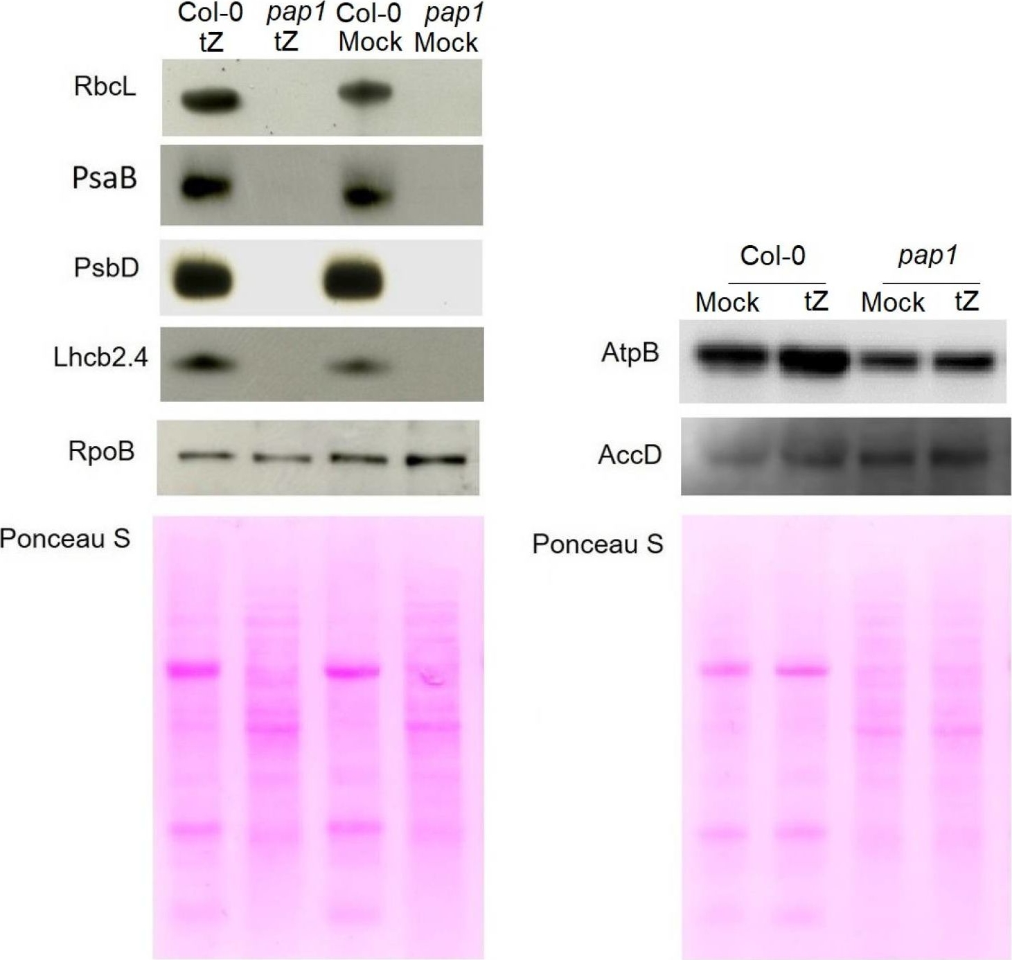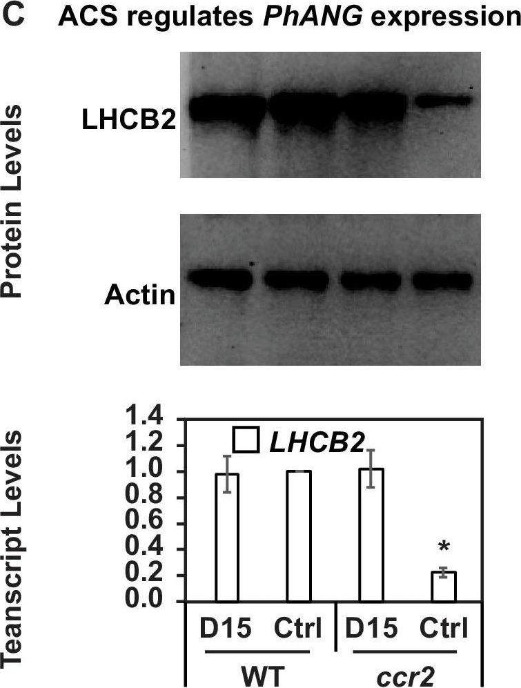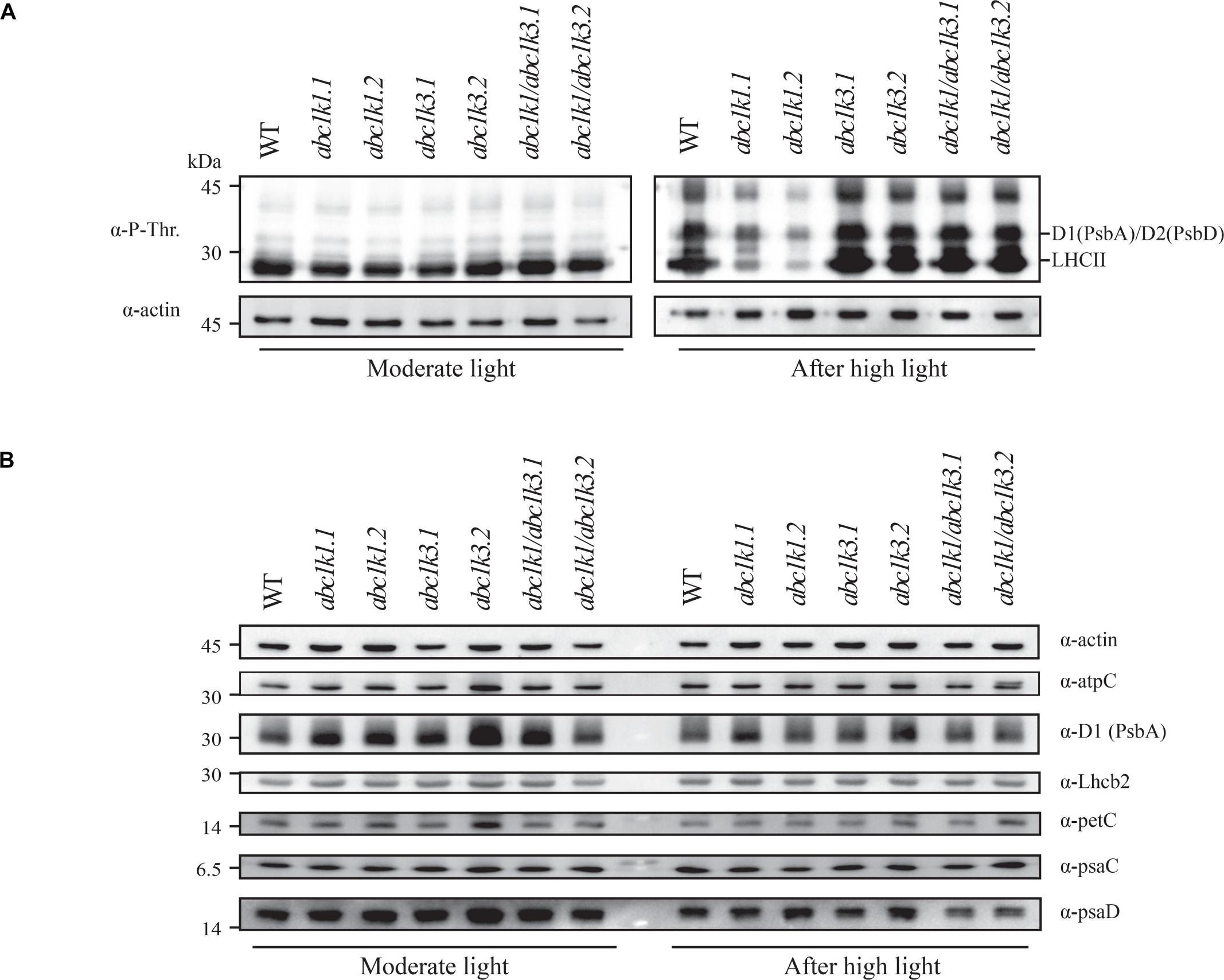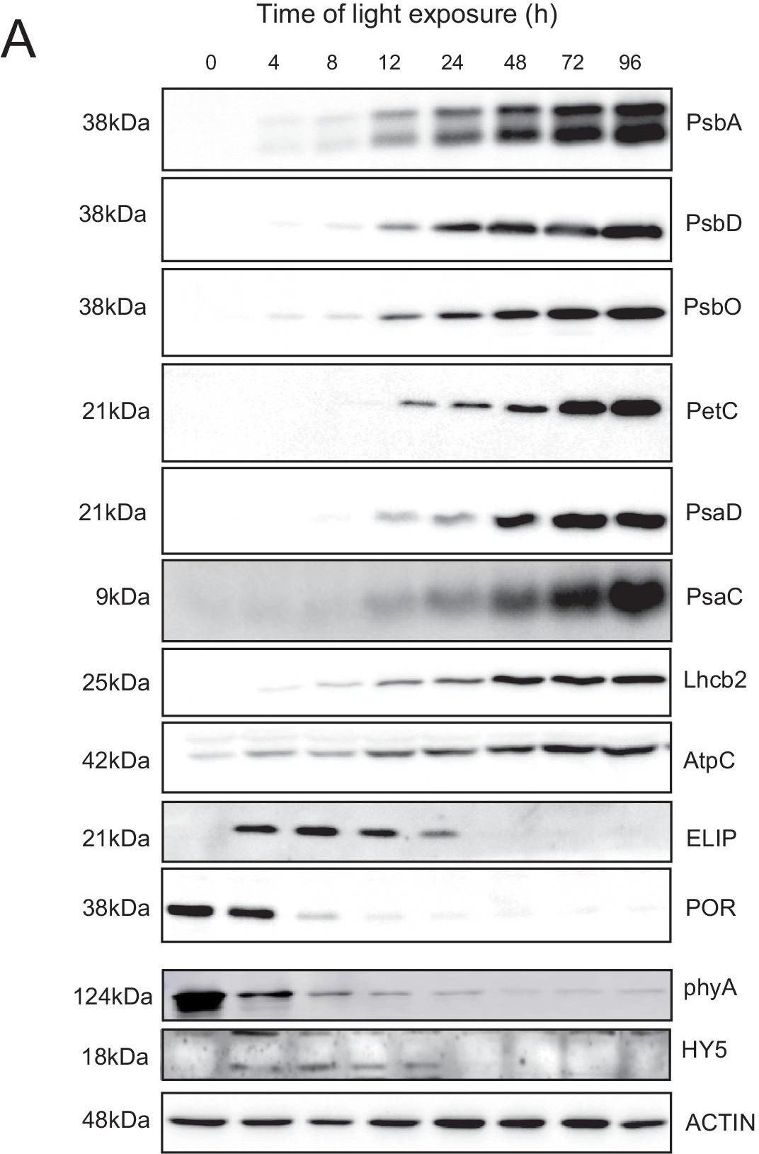| Application examples: | Reactant: Plant Application: Western Blotting Pudmed ID: 27590049 Journal: BMC Plant Biol Figure Number: 9A Published Date: 2016-09-02 First Author: Mazur, R., Sadowska, M., et al. Impact Factor: 4.142 Open PublicationChanges of PSII and PSI antenna and core protein levels. Proteins from control and Tl-treated white mustard leaves were separated by SDS-PAGE followed by immunodetection with antibodies against Lhcb1, Lhcb2, Lhca1 (antenna proteins) and D1, D2, CP43, PsbO, PsaA (core proteins). Samples were loaded on the equal amount of chlorophyll (0.25 ?g). Description of samples abbreviation as given in the legend to Fig. 3 Reactant: Arabidopsis thaliana (Thale cress) Application: Western Blotting Pudmed ID: 31240258 Journal: Commun Biol Figure Number: 2b Published Date: 2019-06-27 First Author: Pralon, T., Shanmugabalaji, V., et al. Impact Factor: None Open PublicationThylakoid protein phosphorylation and state transitions are disturbed after high light treatment in pgr6 background. a Total protein extracts of 4-week-old wild type (WT), pgr6-1, pgr6?2, sps2 and stn7/stn8 analysed by immunoblotting with anti-phosphothreonine antibody; the principal thylakoid phospho proteins are indicated on the right according to their size. Core photosystem II proteins D1 (PsbA) and D2 (PsbD) are indicated as a single band due to their poor resolution. Actin was used as a loading control. b Lhcb1 and Lhcb2 phosphorylation levels were visualised after separation on Phostag™-pendant acrylamide gels. The upper band corresponds to the phosphorylated form (p-), stn7/stn8 double mutant is a non-phosphorylated control. c Average transient of the variable room temperature chlorophyll fluorescence measured during the transition from red (660nm) supplemented with far-red light (720nm) state 1 to pure red light state 2 (n?=?4 independent pots containing 2–3 plants). The fluorescence curves from pgr6 and sps2 are shifted on the x-axis to allow visualising the FMST1 and FMST2 values. The x-axis time scale refers to the wild-type curve. d Calculated quenching related to state transition (qT?=?(FMST1?–?FMST2)/FM), expressed as the percentage of FM that is dissipated by the state 1 to state 2 transition, of wild type (WT), pgr6?1 and sps2 under moderate light (120?mol?m?2?s?1) (ML) and after 3?h of high light (500?mol?m?2?s?1) (HL). Whiskers and box plot shows the minimum, first quartile, median, average, third quartile and maximum of each dataset (n?=?4 biologically independent samples); p-values are calculated via a two-tailed Student’s t test. e STN7 phosphorylation level visualised after separation on Phostag™-pendant acrylamide gels. The upper band corresponds to the phosphorylated form (p-), a protein sample from stn7/stn8 double mutant was loaded as a control for the antibody specificity. Uncropped images of the membranes displayed in a, b and e are available as Supplementary Fig. 11. Data points for items c, d are available as Supplementary data 2 Reactant: Arabidopsis thaliana (Thale cress) Application: Western Blotting Pudmed ID: 32003746 Journal: Elife Figure Number: 8C Published Date: 2020-01-31 First Author: Cazzonelli, C. I., Hou, X., et al. Impact Factor: 7.448 Open PublicationChemical inhibition of CCD activity revealed how a ccr2 generated apocarotenoid signal transcriptionally represses HY5 and LHCB2 expression during photomorphogenesis.(A) Transcript levels of PIF3 and HY5 in WT, ccr2, ccr2 det1-154 and det1-154 de-etiolated seedlings growing on MS media + /- D15. (B) Representative western blot images showing PIF3 and HY5 protein levels in WT, ccr2, ccr2 det1-154 and det1-154 de-etiolated seedlings growing on MS media + /- D15. The membrane was re-probed using anti-Actin antibody as an internal loading control. (C) Protein and transcript levels of LHCB2 expression in WT and ccr2 de-etiolated seedlings growing on MS media + /- D15. (D) Model showing how ACS regulates HY5 and LHCB2 expression in ccr2. Images of seedlings represent are cotyledons are coloured green or yellow to reflect the delay in chlorophyll biosynthesis induced by ACS as evidenced in Figure 6c. De-etiolation of seedlings was performed by transferring 4-d-old etiolated seedlings to continuous light for 3 d to induce photomorphogenesis. Statistical analysis denoted as a star was performed by pair-wise t-test (p<0.05). Error bars represent standard error of means. Ctrl; Control; Ctrl, D15; chemical inhibitor of CCD activity. Reactant: Arabidopsis thaliana (Thale cress) Application: Western Blotting Pudmed ID: 32269582 Journal: Front Plant Sci Figure Number: 7A,B Published Date: 2020-04-10 First Author: Pralon, T., Collombat, J., et al. Impact Factor: 5.435 Open PublicationDouble mutant maintains thylakoid protein phosphorylation and state transitions after high light. (A) Total protein extracts of wild type (WT), abc1k1.1, -2, abc1k3.1, -2, and abc1k1/abc1k3.1, -2 light-exposed leaves were separated by SDS PAGE, transferred on nitrocellulose membrane and decorated with anti-phosphothreonine antibody. The main thylakoid phospho-proteins are indicated on the right according to their size. Core photosystem II proteins D1 (PsbA) and D2 (PsbD) are indicated together due their poor resolution. (B) The accumulation of the principal photosynthetic complexes was assessed using antibodies against specific subunits of each complex: anti-Lhcb2 for the major LHCII, anti-D1 (PsbA) for PSII, anti-PetC for cytochrome b6f, anti-PsaD and anti-PsaC for PSI, and anti-AtpC for ATP synthase. Actin signal is shown as a loading control. (C) Fluorescence quenching related to the state transitions (qT) of wild type (WT), abc1k1.1, -2, abc1k3.1, -2, and abc1k1/abc1k3.1, -2 under moderate light (120 ?mol of photons m–2 s–1) (ML) and after 3 h of high light (500 ?mol of photons m–2 s–1) (HL). qT was calculated from the maximal chlorophyll fluorescence measured after 10 min exposure to red light (660 nm) supplemented wit