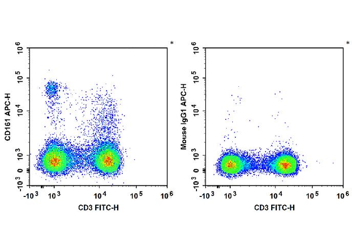 Rat splenocytes are stained with FITC Anti-Rat CD3 Antibody and APC Anti-Rat CD161 Antibody (Left). Splenocytes are stained with FITC Anti-Rat CD3 Antibody and APC Mouse IgG1, κ Isotype Control (Right).