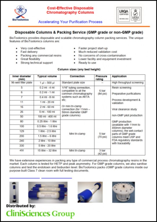BioToolomics is a life science company specializing in the design, development, and manufacturing of innovative process chromatography media and columns for the bioscience and bioprocessing industry. Established in February 2006 and headquartered in the North East of England, BioToolomics provides application-driven, cost-effective process chromatography media, columns, and associated purification technologies. Their products and services are designed for use in biopharmaceutical and life science-related industries. Here are some highlights: 1. Chromatography Media and Columns: