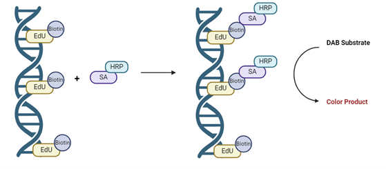 EdU Imaging Kits (DAB) specifically labels the DNA of proliferating cells after biotin azide is ligated to EdU, then adds horseradish peroxidase-labeled streptavidin (HRP-Streptavidin) to bind biotin, developing by DAB chromogen, and finally visualized by microscopy.