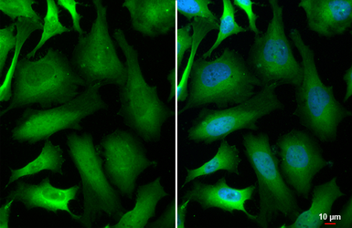 GAPDH antibody detects GAPDH protein at endoplasmic reticulum, cytoplasm and nucleus by immunofluorescent analysis.Sample: HeLa cells were fixed in 4% paraformaldehyde at RT for 15 min.Green: GAPDH stained by GAPDH antibody (GTX100118) diluted at 1:500.Blue: Fluoroshield with DAPI (GTX30920).
