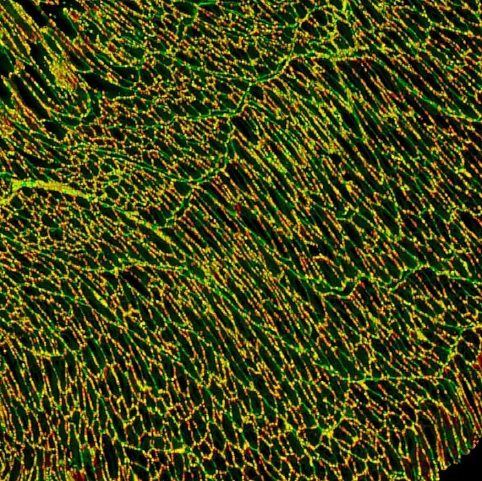 PFA-fixed, rat jejunum cryosections stained with 1X NucSpot® 568/580 (red) and CF®488A WGA (green) and imaged by confocal microscopy.