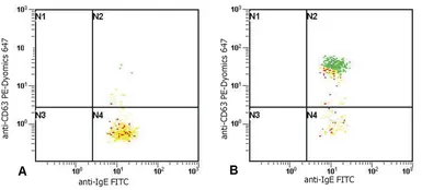 FACS analysis of activated basophils ( normal heparin-treated whole blood stimulation with combination of IL-3 and Goat anti-IgE polyclonal antibody) detected by CD63 antibody [MEM-259] and GTX30876 Human IgE antibody [BE5] (FITC).