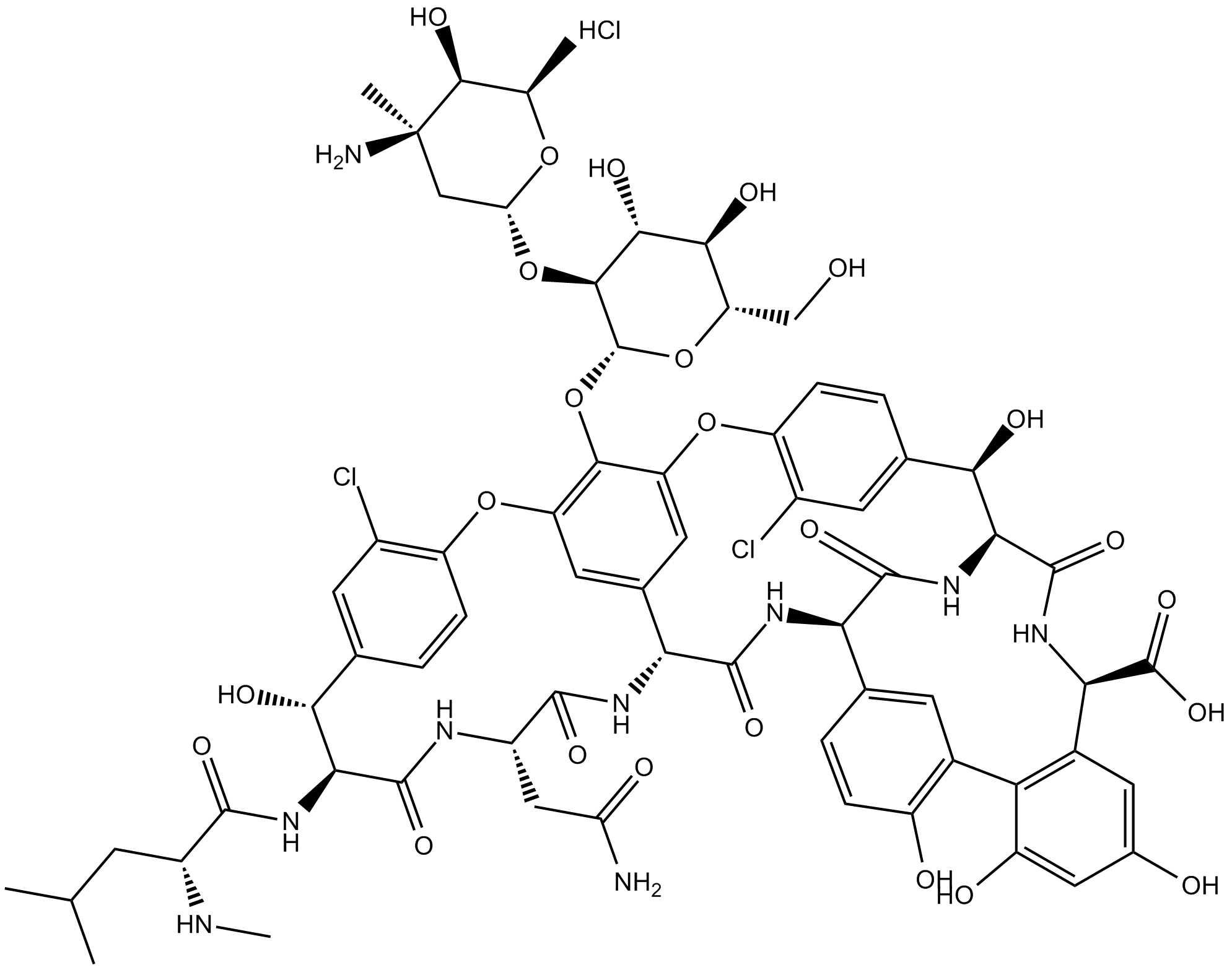Vancomycin hydrochloride (CAS 1404-93-9) is a glycopeptide antibacterial agent, commonly employed in microbiological and drug resistance research due to its specific inhibitory activity. Its antibacterial function derives from the inhibition of bacterial cell wall synthesis through binding directly to D-alanyl-D-alanine terminal residues of peptidoglycan precursors, consequently disrupting cell-wall assembly in Gram-positive bacteria. Typically, vancomycin hydrochloride serves as a positive control in assays evaluating antibiotic resistance profiles, bacterial susceptibility tests, and screening studies related to novel glycopeptide-derivatives. Reported inhibitory concentrations (IC50) vary based on bacterial strains tested, generally ranging from approximately 0.5 μg/mL to 2.0 μg/mL under standard laboratory assay conditions.