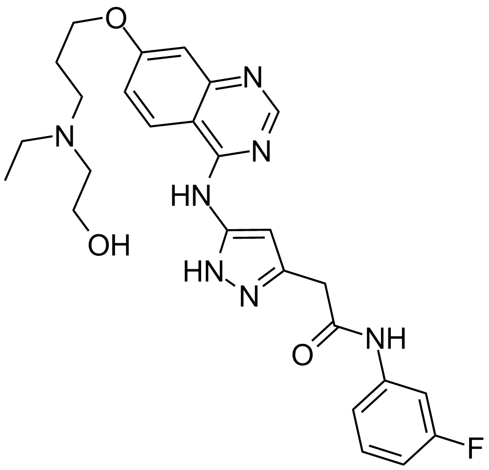 | Chemical Name | 2-[3-[[7-[3-[ethyl(2-hydroxyethyl)amino]propoxy]quinazolin-4-yl]amino]-1H-pyrazol-5-yl]-N-(3-fluorophenyl)acetamide |