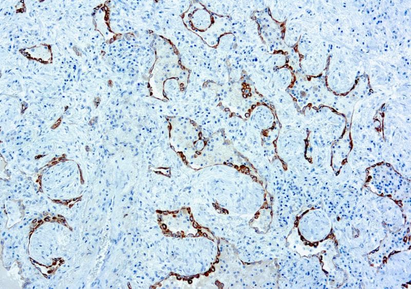 Immunohistochimie sur coupes de paraffine fixées au formalin de tissu pulmonaire humain avec un carcinome cellulaire squameux.