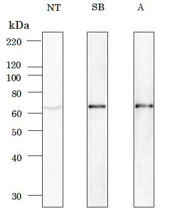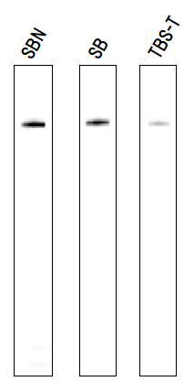 NT: TBS-T; SB: Signal Booster, A: société A; Échantillon: Lysat de cellules HepG2 exprimant la luciférase; 1er Ac: anti-luciférase IgG, polyclonal de chèvre, dilué à 1/1000 dans la solution A; 2nd Ac: anti-IgG de chèvre, étiqueté HRP, dilué à 1/20000 dans la solution B.