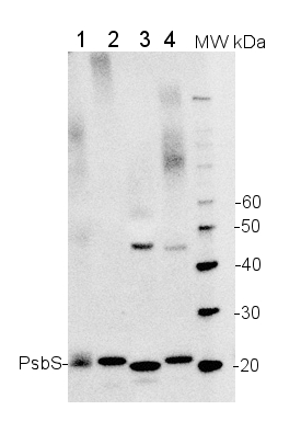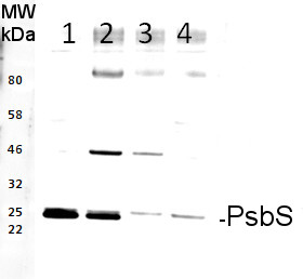 - Tim | 2025-04-14We tested a panel of antibodies targeting various photosynthetic proteins, including both light-harvesting complex proteins (e.g., Lhcb1 or Lhcb2) and core complex components (e.g., PsbC). Across all experiments, the antibodies demonstrated strong specificity and reliable performance. The resulting immunoblot signals were clear, well-defined, and reproducible, with minimal background or non-specific binding.amil Trzebuniak | 2020-03-06I have used this antibody to distinguish between Wild Type Arabidopsis thaliana and PsbS-lacking mutants. For my Western Blott I have used the antibody with the recommended dilution (1:2000) while the total protein load was 20 ug per well. The obtained results were really nice there was a clear band in the T plants and no signal was obtained from the mutant plants.