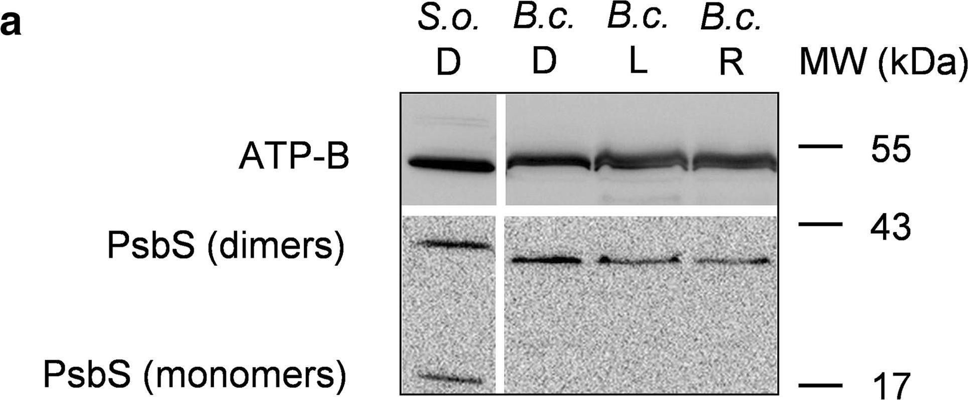 | Application examples: | Reactant: Algae Application: Western Blotting Pudmed ID: 29460179 Journal: Planta Figure Number: 7A Published Date: 2018-06-01 First Author: Giovagnetti, V., Han, G., et al. Impact Factor: 3.95 Open PublicationWestern blot analysis of PsbS and LHCSR proteins from dark-adapted (D, 30 min), light-treated (L, 2500 µmol photons m?2 s?1, 30 min) and post-dark-recovery chloroplasts (R, 1 h) isolated from B. corticulans. Samples were analysed by immunoblotting with an anti-PsbS (a), anti-LHCSR3 (b) and anti-LHCSR1 antibodies (c). Control samples are dark-adapted S. oleracea (a) and C. reinhardtii chloroplasts (b, c). Note that B. corticulans and S. oleracea samples have been probed against anti-PsbS antibody in the same membrane. The separation between lanes is only due to the presence of different samples between those presented of S. oleracea and B. corticulans (a). The ? subunit of ATP synthase (ATP-B) was used as loading control. 10 µg of Chl was loaded in each lane Reactant: Nicotiana tabacum (Common tobacco) Application: Western Blotting Pudmed ID: 29511193 Journal: Nat Commun Figure Number: 1C Published Date: 2018-03-06 First Author: G?owacka, K., Kromdijk, J., et al. Impact Factor: 13.783 Open PublicationPhotosynthesis and water-use efficiency in Nicotiana tabacum plants with modified PsbS levels. aPsbS mRNA levels normalized to actin and tubulin sampled from fully expanded leaves of psbs-4, PSBS-28, PSBS-43 and wild-type (WT) N. tabacum plants. b PsbS protein levels normalized to the large subunit of oxygen-evolving complex of photosystem II (PsbO), determined from densitometry on immunoblots. c Representative immunoblot for PsbS and PsbO. d Net CO2 fixation rate (An), e NPQ, f quinone A (QA) redox state, and g stomatal conductance (gs) as a function of incident light intensity in fully expanded leaves. h Linear correlation between QA redox state and gs. Broken lines indicate measurements at highest light intensity. i Linear correlation between PsbS protein levels and intrinsic water-use efficiency (An/gs) at light intensity above 600??mol?m?2?s?1. Asterisks/lines show significant differences from WT (black for silencing, red for overexpressing lines; Dunnett’s two-way test; ??=?0.05). Error bars indicate s.e.m. (n?=?from 6 to 10 biological replicates) Reactant: Solanum lycopersicum (Tomato) Application: Western Blotting Pudmed ID: 34439953 Journal: Biology (Basel) Figure Number: 9A Published Date: 2021-07-28 First Author: Trojak, M. & Skowron, E. Impact Factor: None Open PublicationWestern Blot analyses (a) and densitometric analyses of PsbS (b), VDE (c), PGRL1 (d), and cytf (e) proteins in leaves of tomato plants (Solanum lycopersicum L. cv. Malinowy Ozarowski) grown under different light conditions (see Material and Methods for details). The bands were normalized to the appropriate ? subunit of ATP synthase (ATPB) band (loading control, Figure S4) (a). The bar diagrams (b–e) represent pixel volumes (densitometric analyses) of proteins in samples. Each value represents the mean ± SD (n = 3) considering the control sample (WL) value as 1 (100%). Different letters indicate significant differences between treatments (p = 0.05) with a Tukey’s HSD test. MW—molecular weight. |