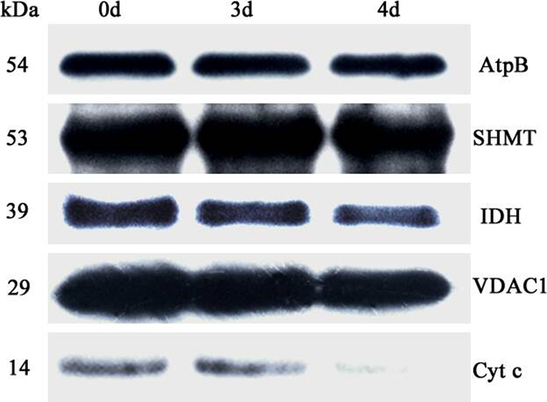 | Application examples: | Reactant: Oryza sativa (Asian rice) Application: Western Blotting Pudmed ID: 27124767 Journal: PLoS One Figure Number: 6A Published Date: 2016-04-29 First Author: Yin, G., Whelan, J., et al. Impact Factor: 2.942 Open PublicationAbundance of a variety of known mitochondrial proteins by the immunoblot analysis of mitochondria isolated from 0 d, 3 d, and 4 d aged rice embryos after 48 h imbibition.Total 10 ?g protein was separated by SDS gel electrophoresis and blotted to supported polyvinylidene difluoride, then probed with antibodies against beta subunit of ATP synthase (AtpB), serine hydroxymethyltransferase (SHMT), isocitrate dehydrogenase (IDH), voltage dependent anion channel 1 (VDAC1) and cytochrome c (Cyt c). |