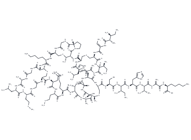 | Smiles | O=C1N2[C@@](CCC2)(C(=O)NCC(=O)N[C@H](C(N[C@H](C(N[C@@H]3[C@H](C)SC[C@@H](C(N[C@H](C(N[C@H](C(N[C@H](C(N[C@@H]4[C@H](C)SC[C@]5(C(=O)N[C@@H](CC6=CN=CN6)C(=O)N[C@H](C(N[C@H](C(N[C@H](C(N[C@@H](CC7=CN=CN7)C(N[C@H](C(NC(C(N[C@@H](CCCCN)C(O)=O)=O)=C)=O)[C@H](C)C)=O)=O)[C@H](CC)C)=O)CO)=O)CS[C@@H](C)[C@@](NC(=O)[C@H](C)NC4=O)(C(=O)N5)16)16)=O)CCCCN)=O)CCSC)=O)CC(N)=O)=O)NC(=O)CNC(=O)[C@H](CCSC)NC(=O)[C@H](CC(C)C)NC(=O)[C@H](C)NC(=O)CNC3=O)=O)CCCCN)=O)CS[C@@H](C)[C@H]1NC(=O)[C@H]8NC(=O)[C@H](CC(C)C)NC(=O)C(=C)NC(=O)[C@]([C@H](CC)C)(NC(=O)[C@H](NC(/C(/NC([C@H]([C@H](CC)C)N)=O)=C/C)=O)CSC8)16)16 |