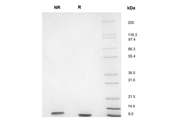 Figure 1. rh EGF (1μg) was resolved with SDS-PAGE under non-reducing (NR) and reducing (R) conditions and visualized by InstantBlue staining showing a single prominent band at 6.2 kDa.
